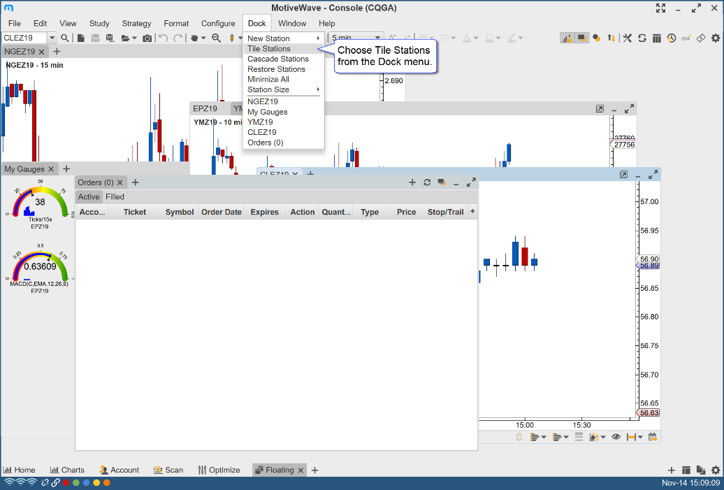 This option will position and size all of the non-minimized stations into a grid format with the last station occupying the remaining space on the bottom row. Choose Dock -> Tile Stations from the top menu bar.