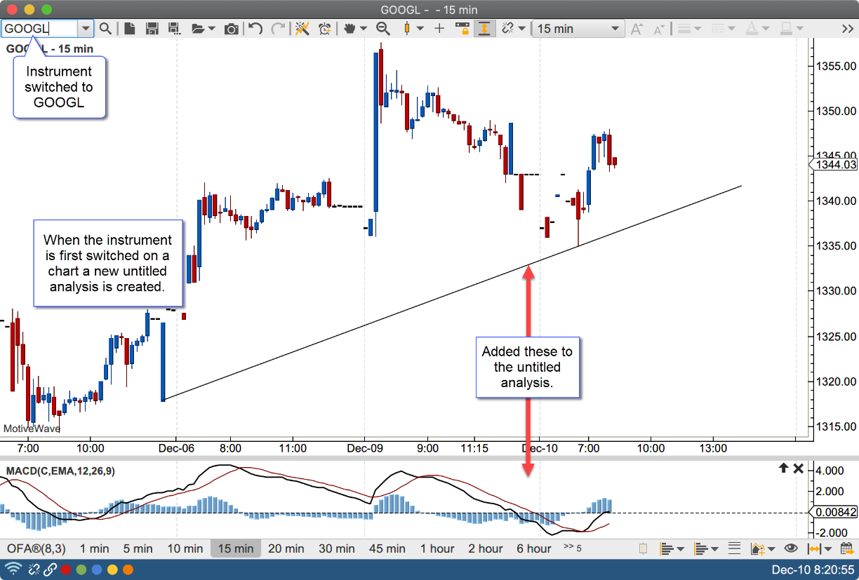In the screen shot below, the instrument for the chart has been changed to GOOGL. Since this is the first time GOOGL has been displayed in the chart, a new untitled (blank) analysis will be created and displayed.