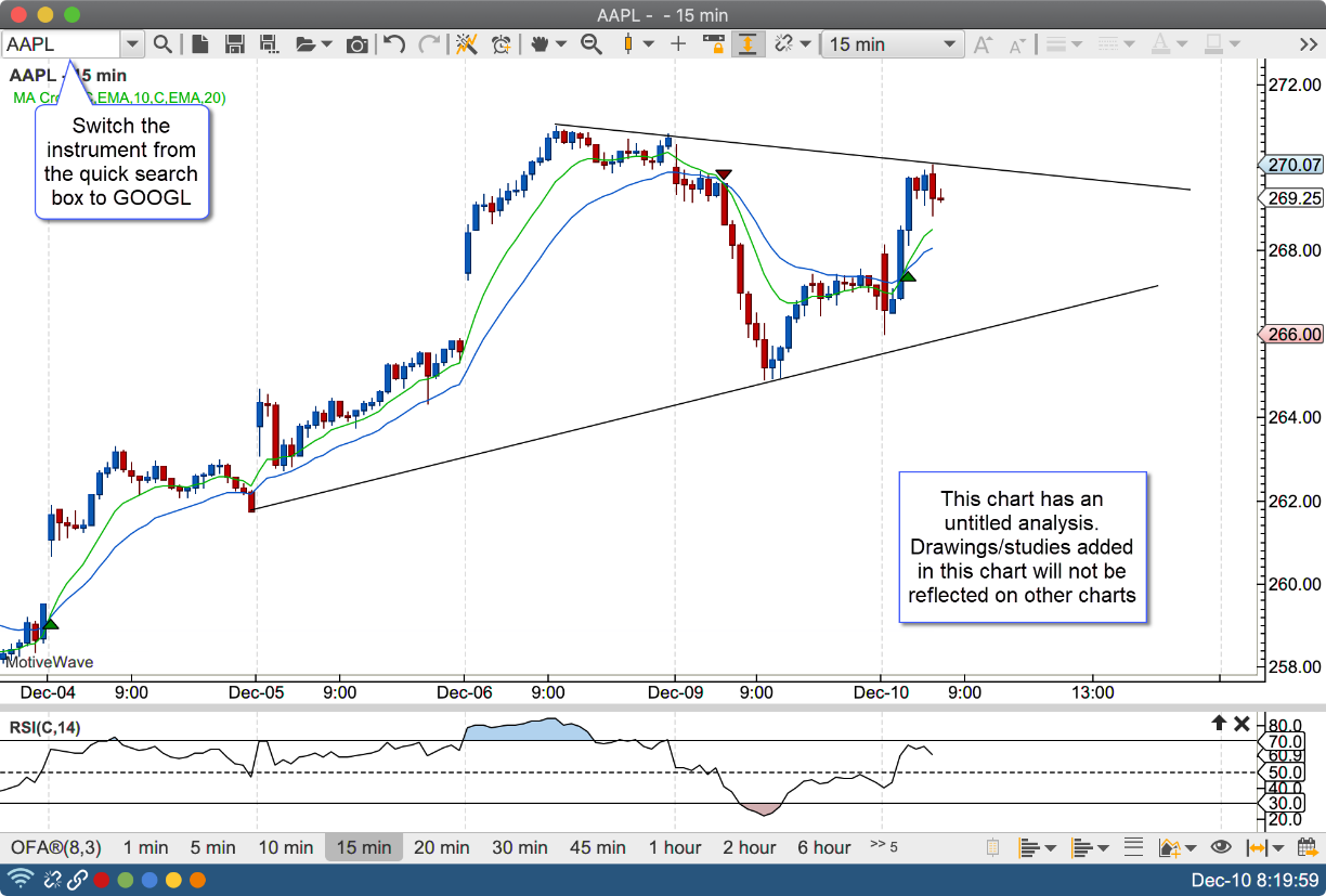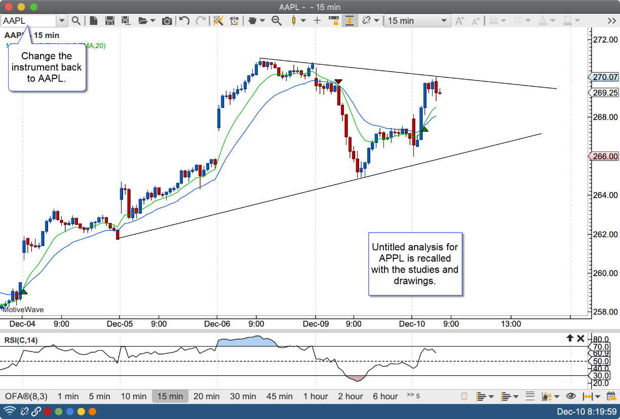 When the instrument for the chart is switched back to APPL, the retained untitled analysis for AAPL will be displayed: