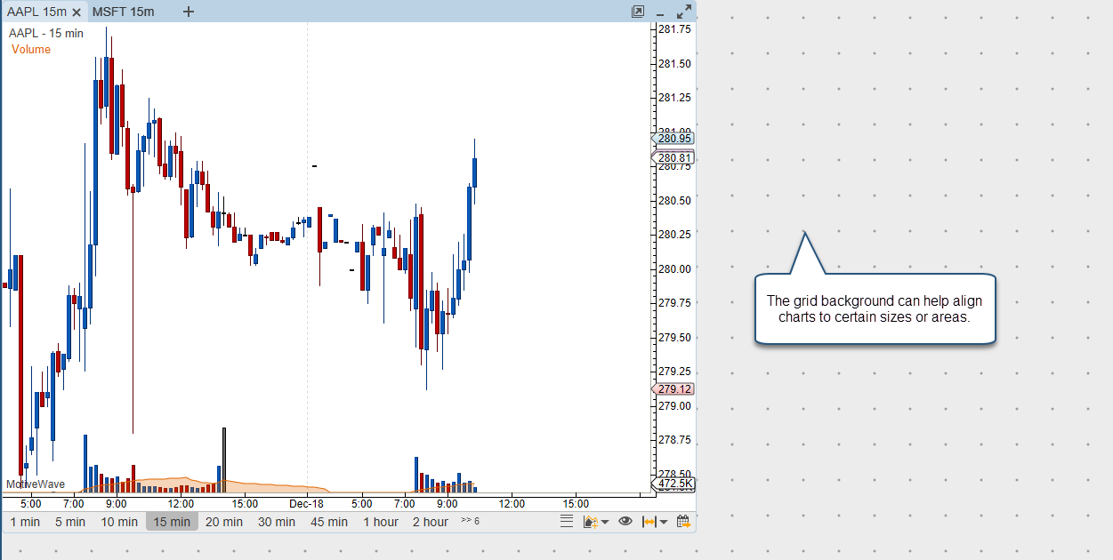 This option (on by default) shows a grid background on the floating layouts. This grid can help align charts to certain areas or sizes. Configuration options can be found in the Preferences dialog (Configure -> Preferences -> General -> Dock).