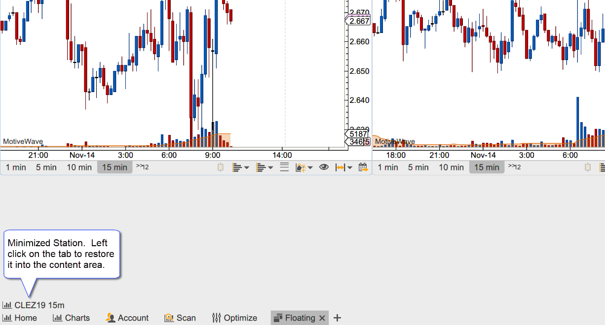 The active tab of the minimized station will appear in the bottom left section of the content area appearing in the order in which they were minimized. Click on a minimized station to restore it to the content area.