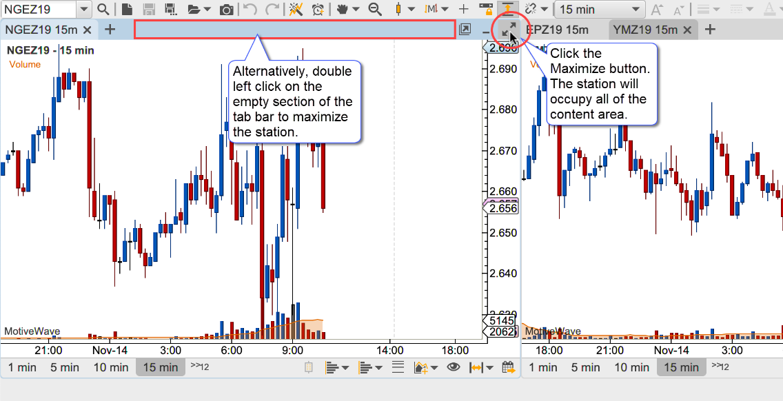 A station may be maximized to occupy the entire viewing area. When a station is maximized its size will change when the window is resized. When the station is restored, its original location and size will be preserved.