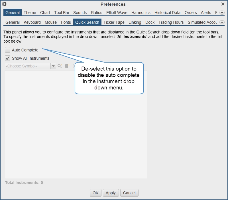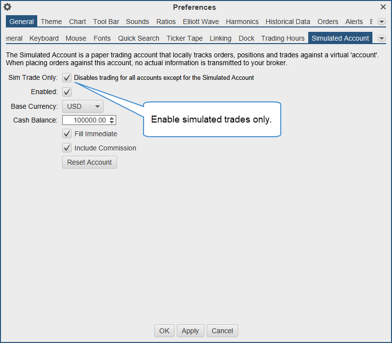 An option has been added to the built-in simulated account to only allow trading on the internal simulated account (Configure > Preferences > General > Simulated Account). This option is very useful if you’re using your brokerage account for data while you place simulated trades.