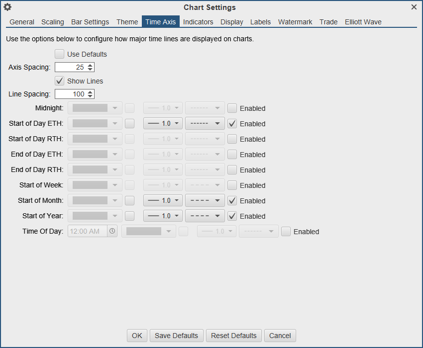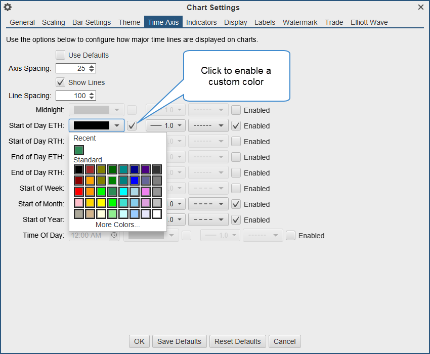 A color can now be chosen for each time axis line that is enabled. Click the checkbox to the right of the color drop down to enable a specific color.