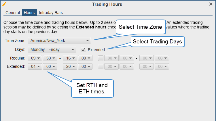 The following enhancements have been added to the Trading Hours feature (See Configure > Preferences > General > Trading Hours).