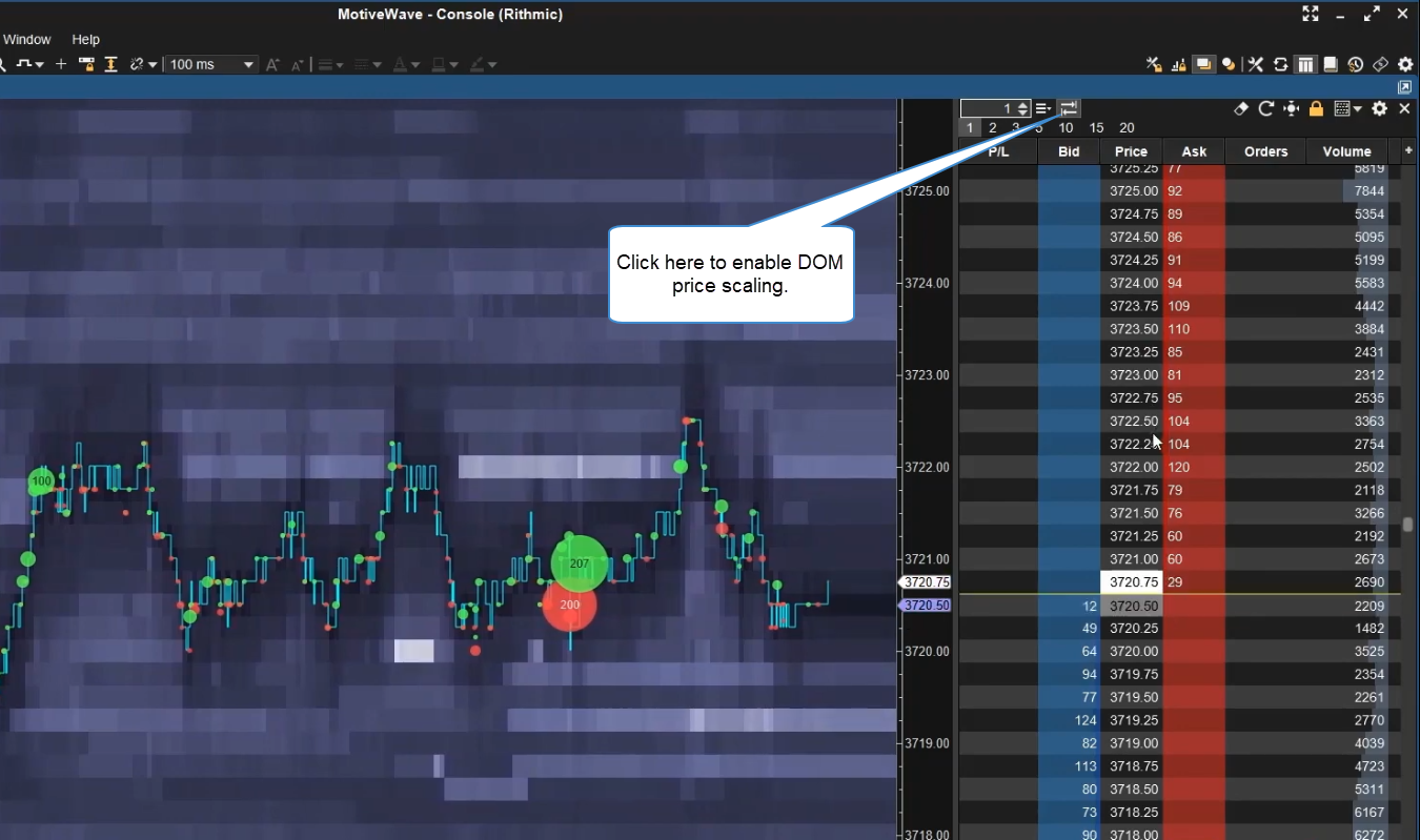 The scaling of the chart can now be synced to the attached DOM (Depth of Market). A new button has been added to the tool bar in the DOM to toggle this chart scaling method on/off.