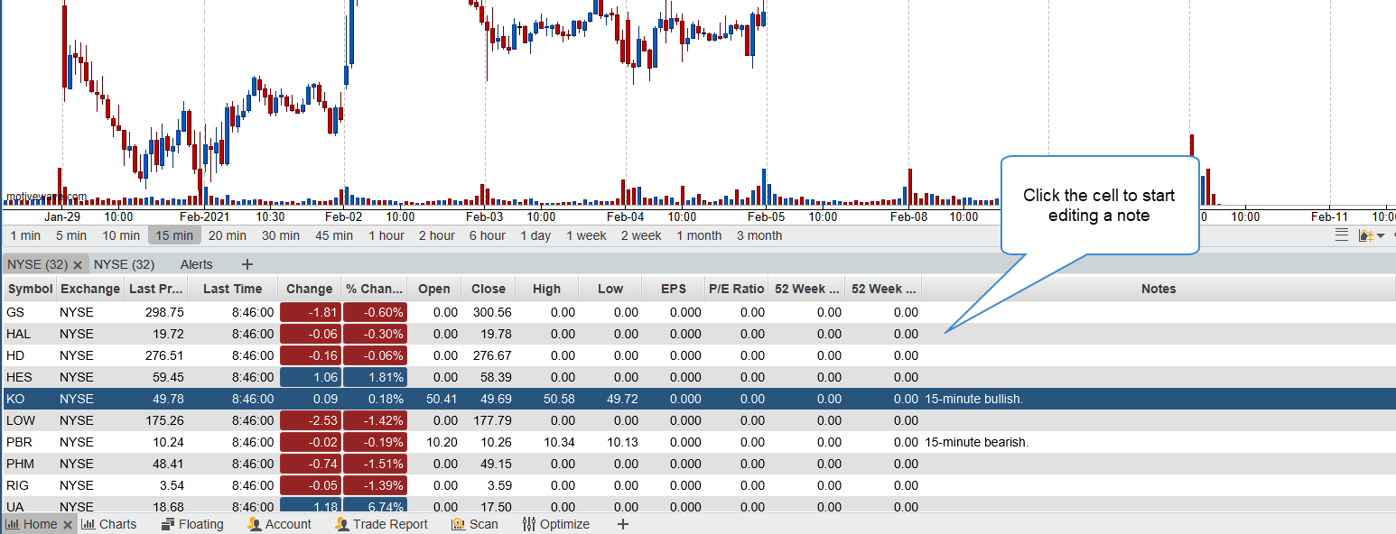 A “Notes” column has been added to Watch Lists where you can enter custom notes. Clicking on the cell in the Watch List will allow you to edit the value in line. The notes are tied to the instrument and can also be edited and viewed in the Edit Instrument dialog.