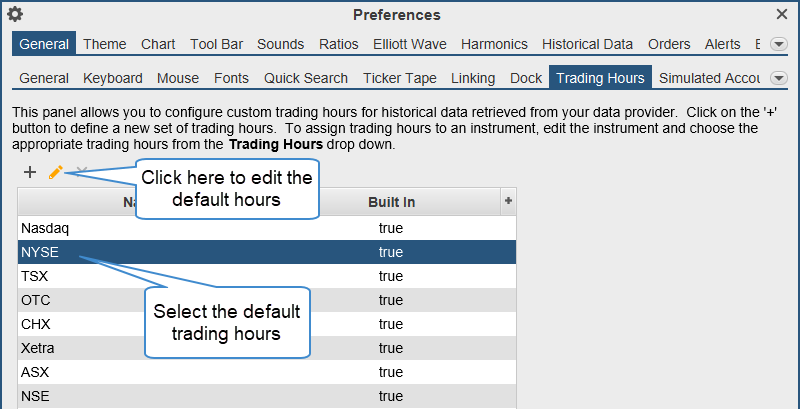 The built-in hours can now be modified instead of creating a new set of trading hours. You can revert to the default hours by selecting the modified hours in the list and pressing the Delete key.