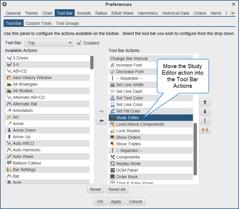 A study editor action is available to add to the tool bar. This is used in conjunction with the Tool Bar option above and will display the selected controls.