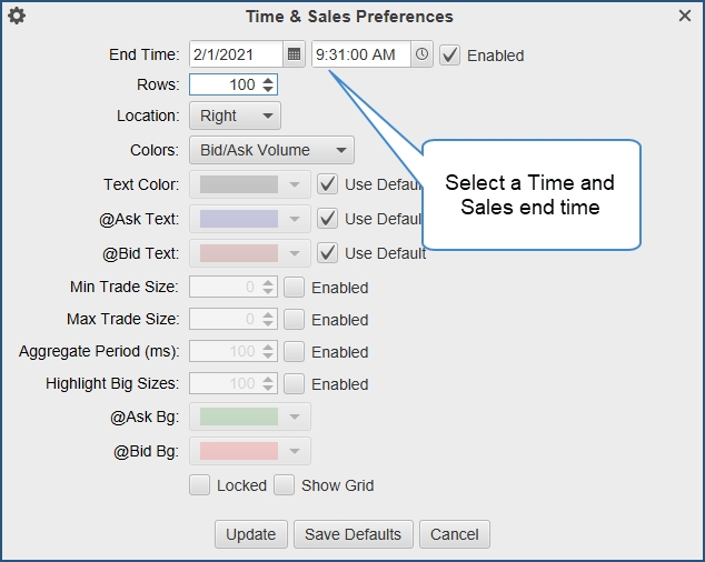 - Time and Sales – Added an optional end time field. This allows you to scroll to a specific time in the Time and sales panel. This can be found in the Time and Sales preferences.