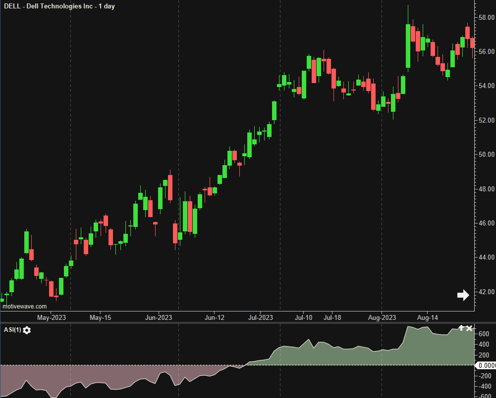 No trading signals are calculated for this indicator. However, when the ASI moves above the 0 line ( ASI is positive), it signals a potential buy trend. Conversely, when the ASI drops below the 0 line (ASI is negative), it suggests an opportunity for a sell trend. In case the ASI approaches closely to the 0 line, the market might be in an uncertain condition and the ASI should be used in conjunction with other indicators.