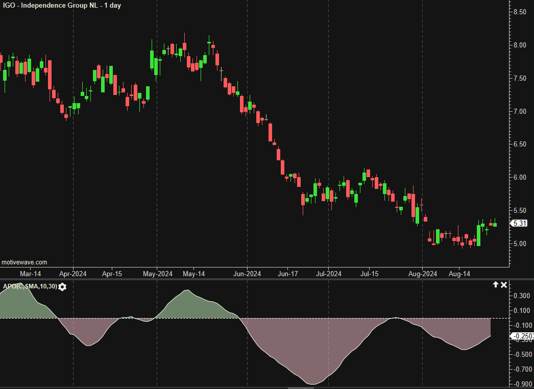 The Absolute Price Oscillator (APO) plots the difference between two moving averages as a real value. The user may change the input (close), method (SMA) and period lengths. This indicator’s definition is further expressed in the condensed code given in the calculation below.