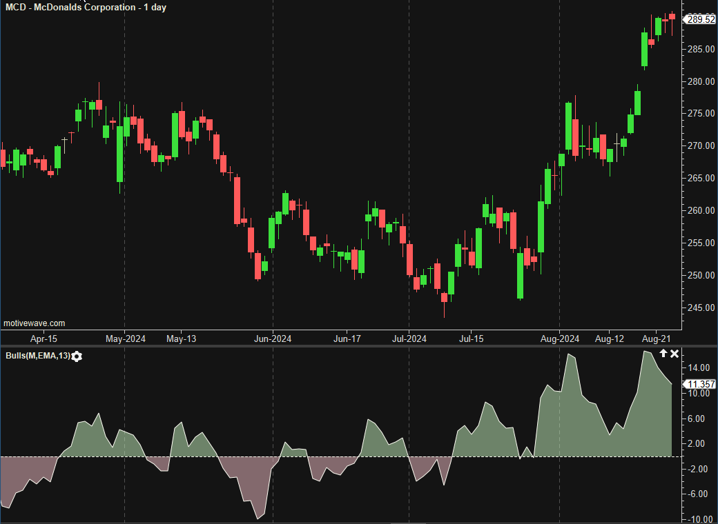 Bulls Power was authored by Alexander Elder. Bulls Power is the difference between the current high and the 13-period exponential moving average. The user may change the input (midpoint), method (EMA) and period length. This indicator’s definition is further expressed in the condensed code given in the calculation below.
