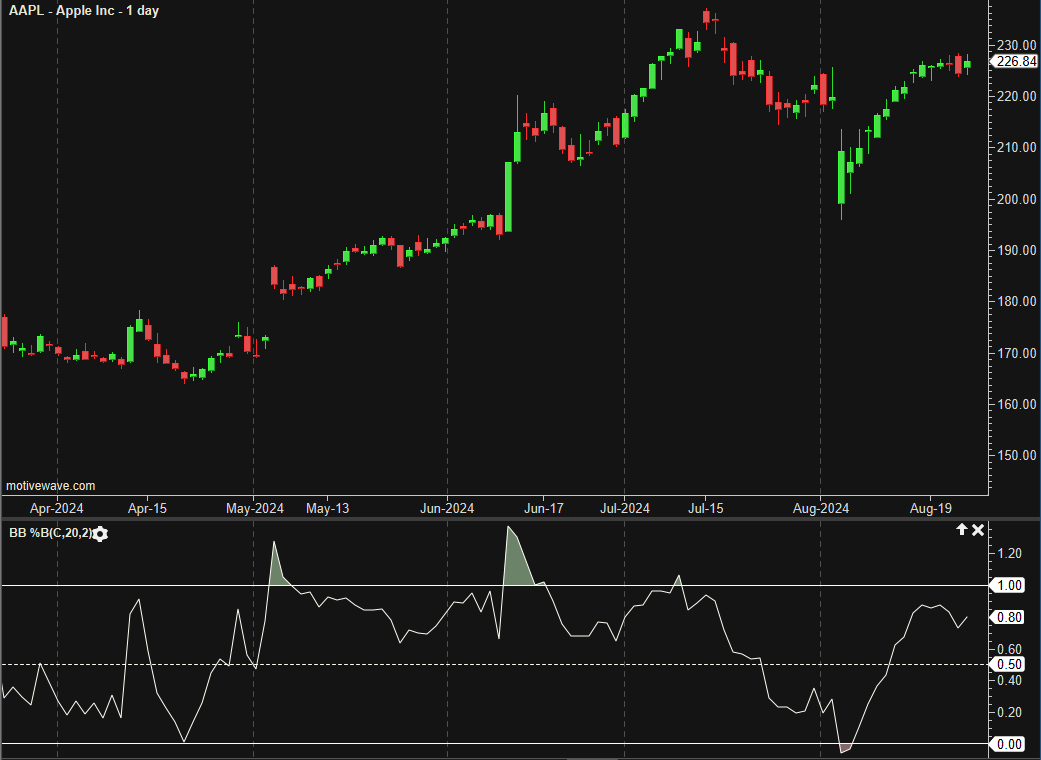 Bollinger Bands® was authored by John Bollinger in the 1980s. The Percent B (PB) plots the instrument’s price relative to the upper and lower Bollinger Bands®. The PB can be used to identify overbought and oversold conditions. The user may change the input (close), period length and standard deviation factor. This indicator’s definition is further expressed in the condensed code given in the calculation below.&#x20;