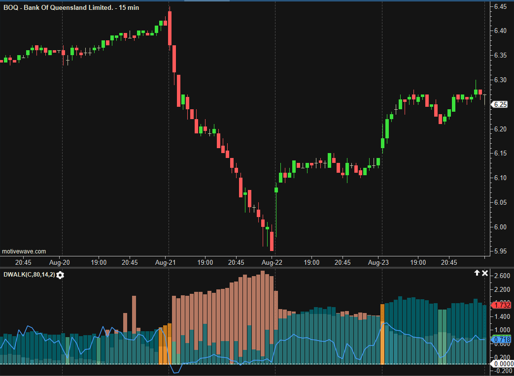 The Drunkard’s Walk may be used with other indicators such as Stochastic Oscillator, Bollinger Bands® and the Commodity Channel Index (CCI). No signals are given for this indicator.