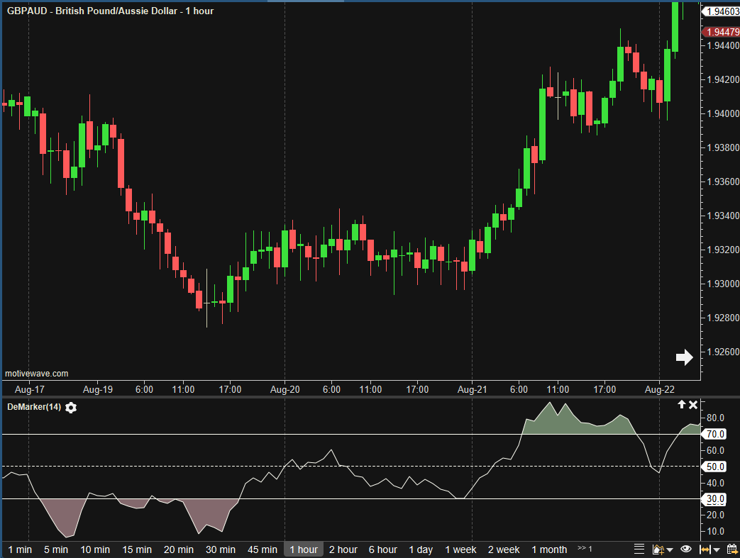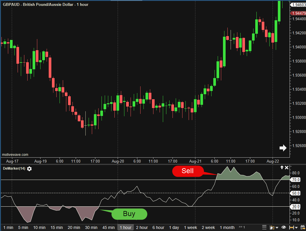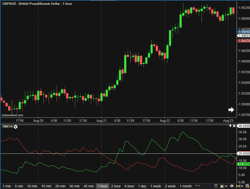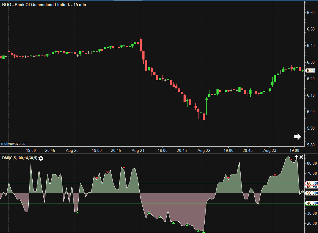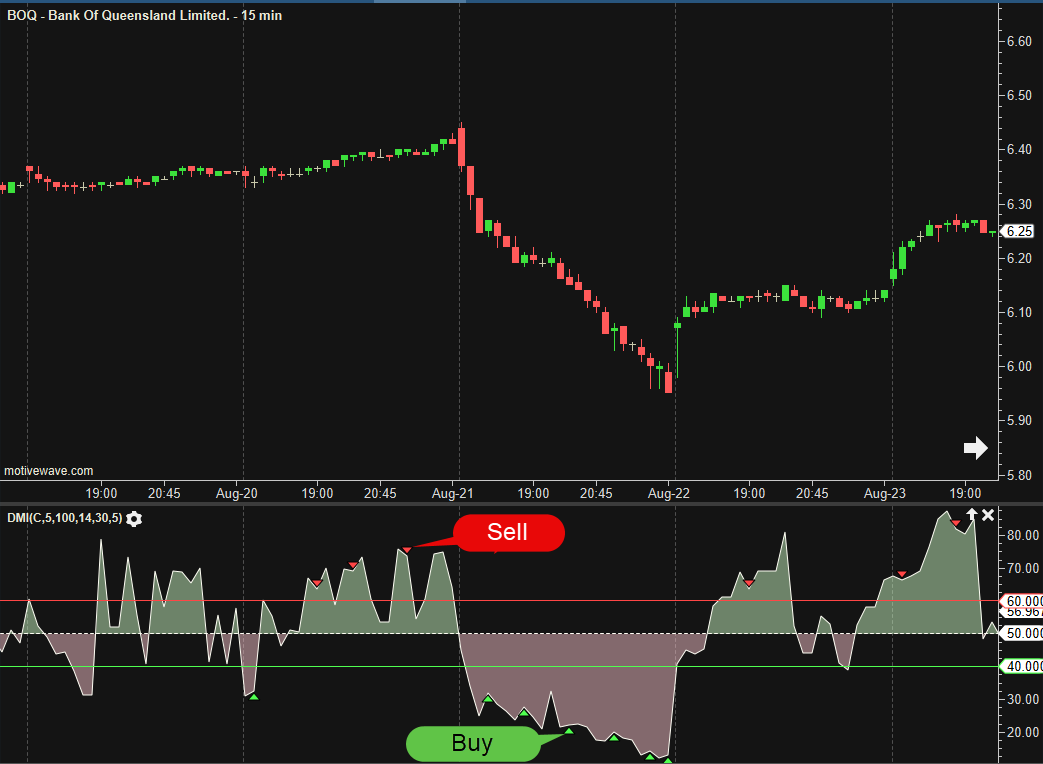 Adjust the top and bottom guides to control the quantity and quality of the trading signals. If the dmi peaks above the top guide a sell signal will be generated. Conversely, if the dmi troughs below the bottom guide a buy signal will be given. The 50 line divides the bulls (above) from the bears (below).