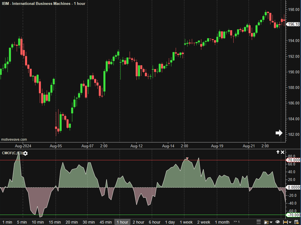 The Chaikin Money Flow Index (CMF) was authored by Marc Chaikin. The CMF is an oscillator derived from the Accumulation/Distribution Line. CMF values are calculated by adding all of the A/D line values for the period and dividing this by the total volume for the period. The user may change only the period length. This indicator’s definition is further expressed in the condensed code given in the calculation below.