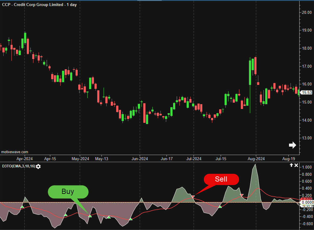 Fine tune the top and bottom guides to control the number and quality of the trading signals. If the D Three Ten (V1) is above the top guide and crosses below the signal line (V2) a sell signal will be generated. Conversely, if the V1 is below the bottom guide and crosses above the signal line (V2) a buy signal will be given. The 0 line divides the bulls (above) from the bears (below).