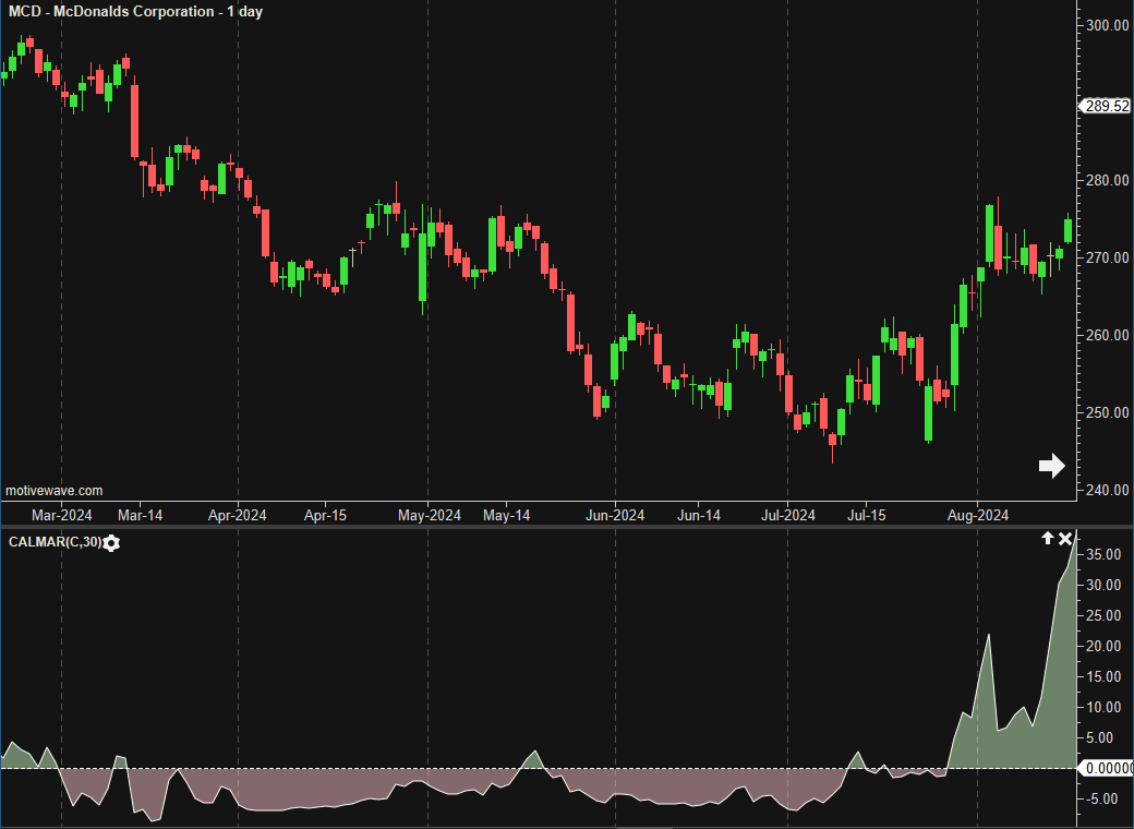 The Calmar Ratio may be used to evaluate an instrument’s performance. No trading signals are calculated.