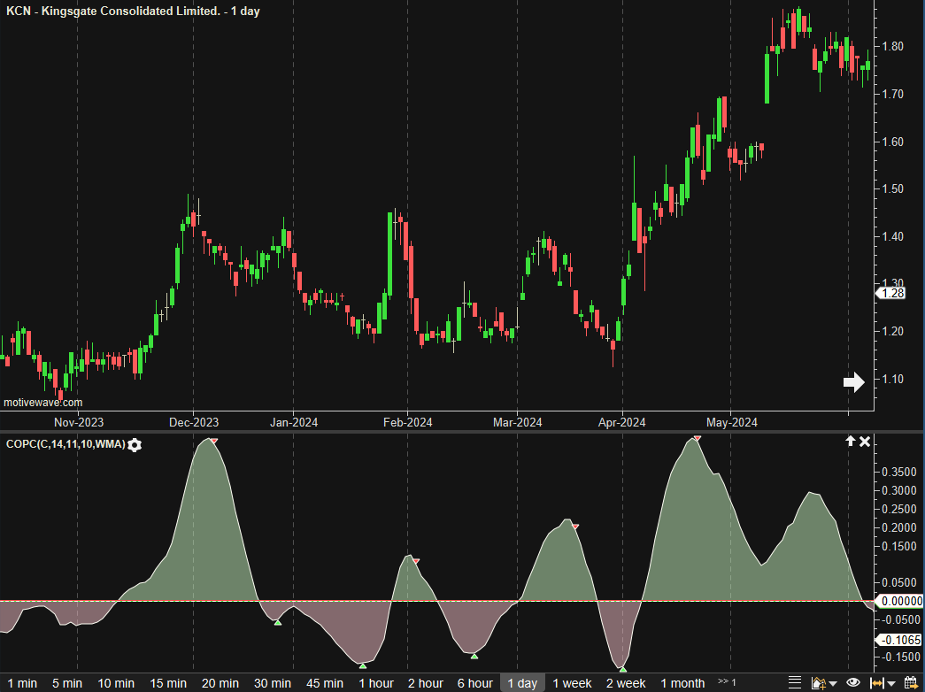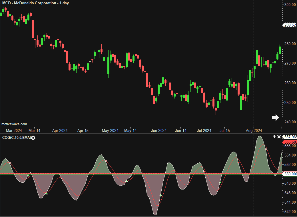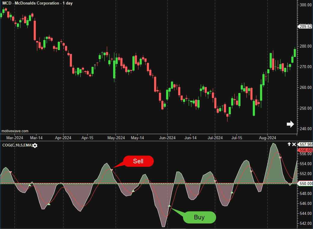 Adjust the top and bottom guides to control the quantity and quality of the trading signals. If the COG is above the top guide and crosses below the signal line a sell signal is generated. Conversely, if the COG is below the bottom guide and crosses above the signal line a buy signal will be given.