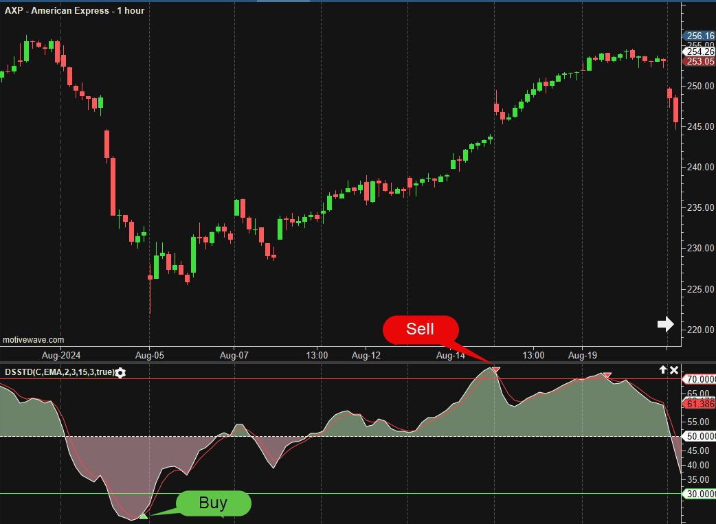 buy = crossedAbove(DSS, SDSS) AND dss lessThan bottomGuide AND dss lessThan lowBuy;