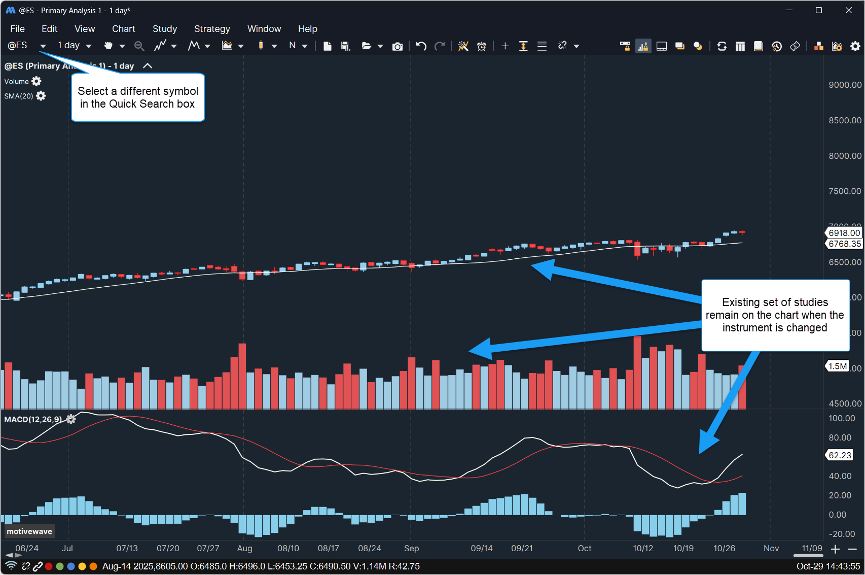 The **Lock Studies** feature is a convenient way to keep the current set of studies on a chart when you change the instrument. Choose ***View > Lock Studies*** from the top menu bar to enable this feature on the selected chart. To change the instrument on a chart, type the new symbol into the **Quick Search** box on the left side of the tool bar and press the *Enter* key.