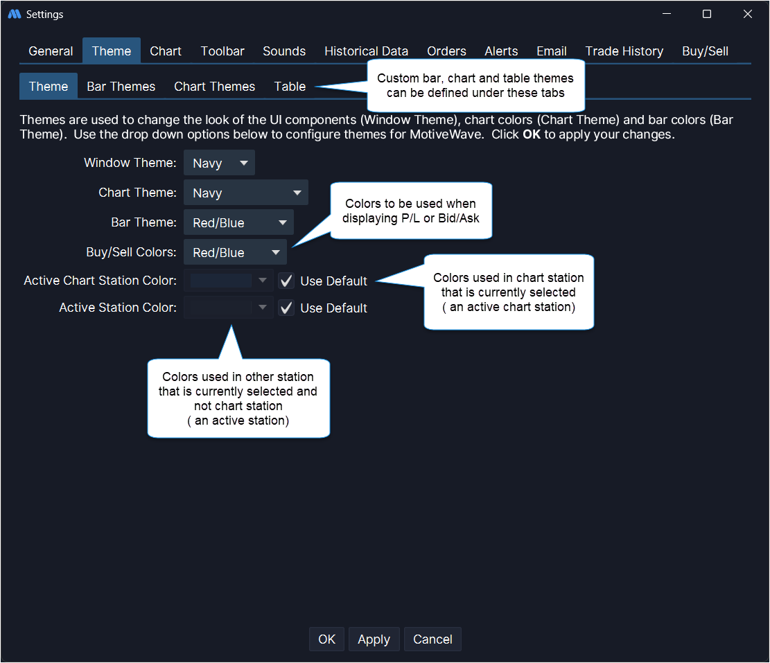 The Themes tab provides several options for changing the look and feel of the window decorations as well as the colors for the chart, tables and buy/sell boxes. Custom **Chart,** **Bar and Table** themes can be defined under the corresponding tabs of this section: