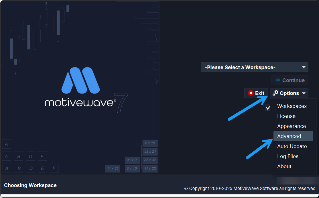 The system font can be selected via the MotiveWave's ***splash screen > Options > Advanced > System Font:***