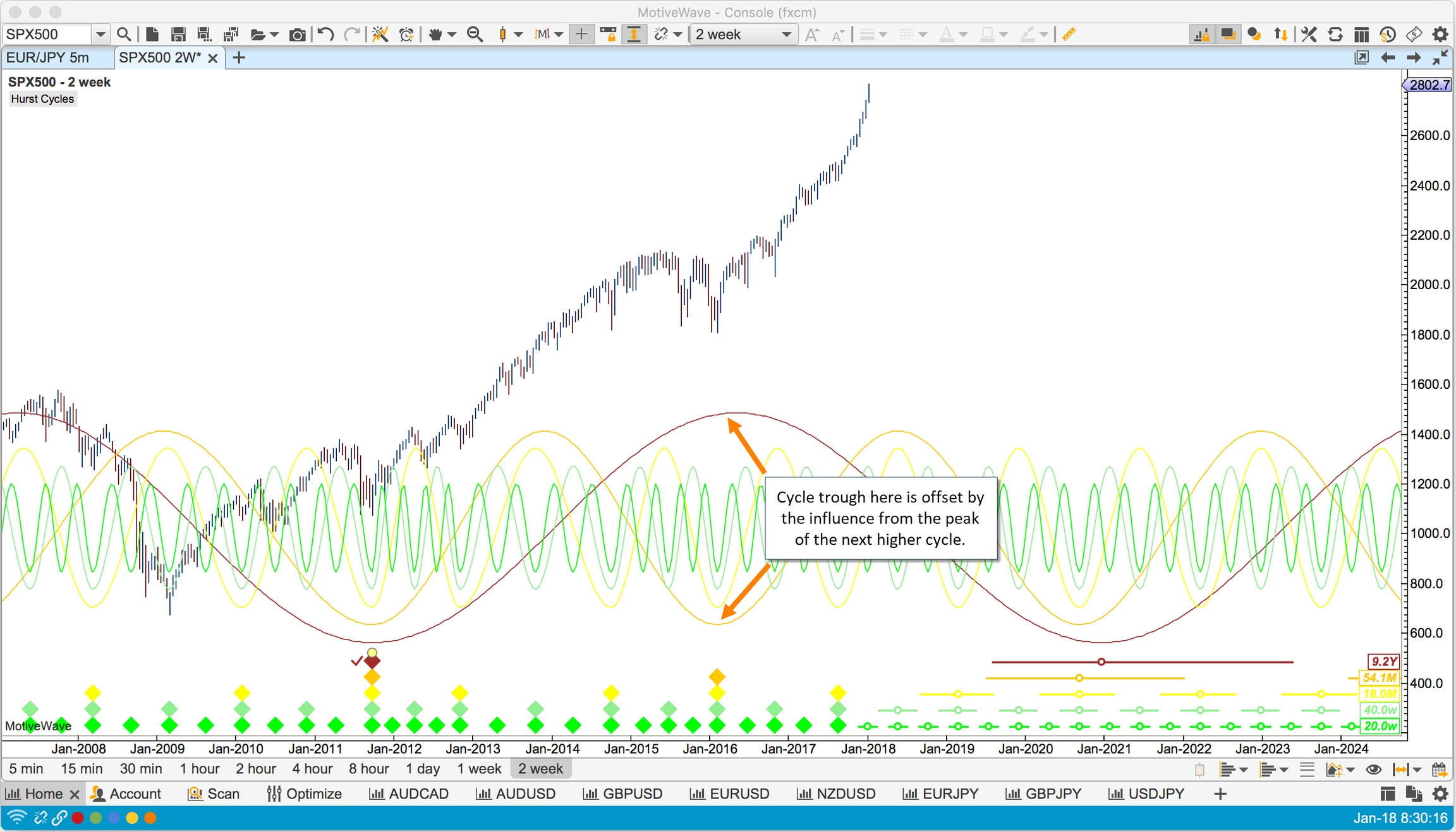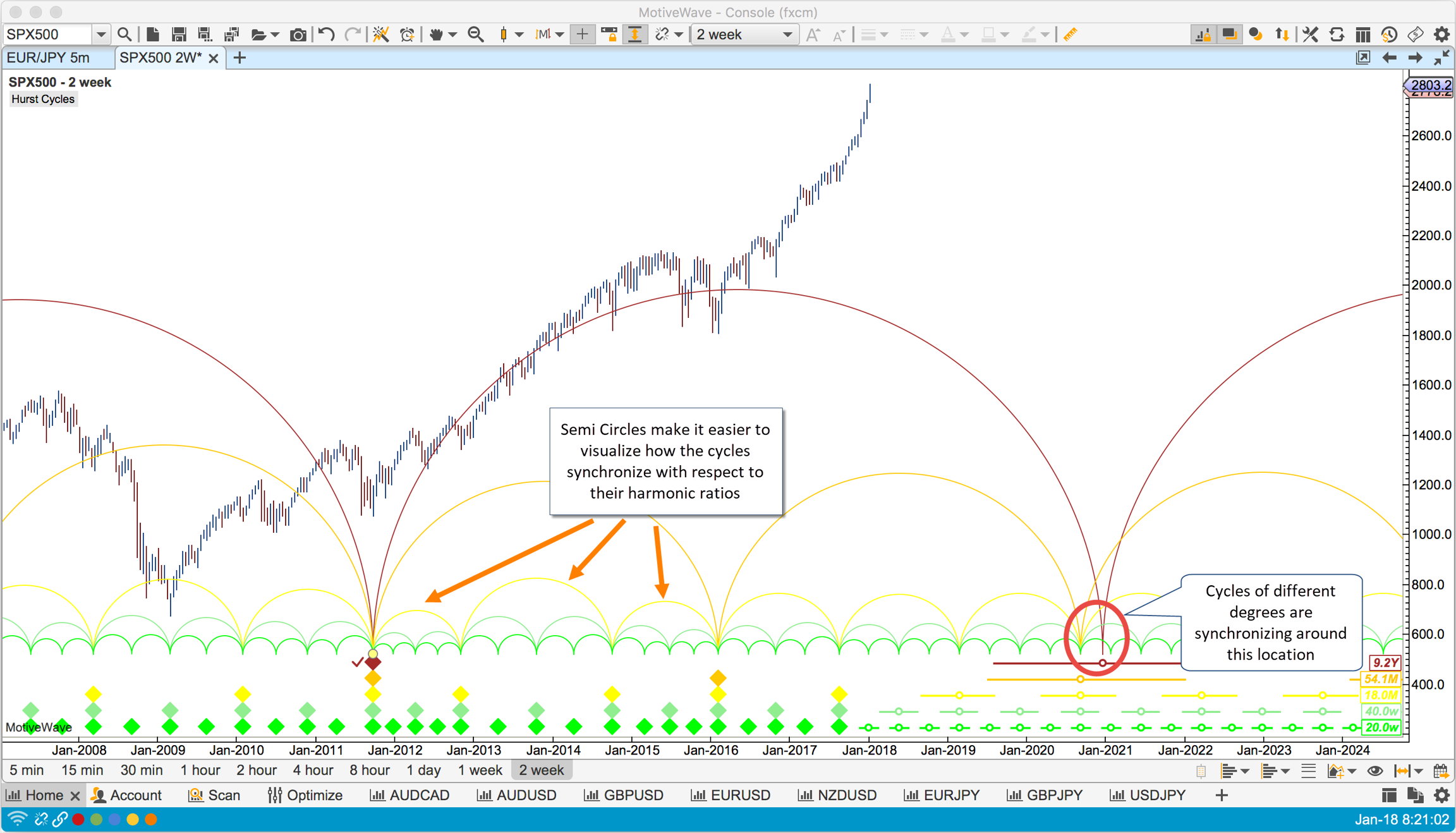 Semi-Circles and Sine Waves may be used to help visualize where the cycles of different degrees align at price troughs (or peaks). Hurst’s cyclic theory states that cycles of different degrees will synchronize at certain points that are determined by their harmonic ratios.