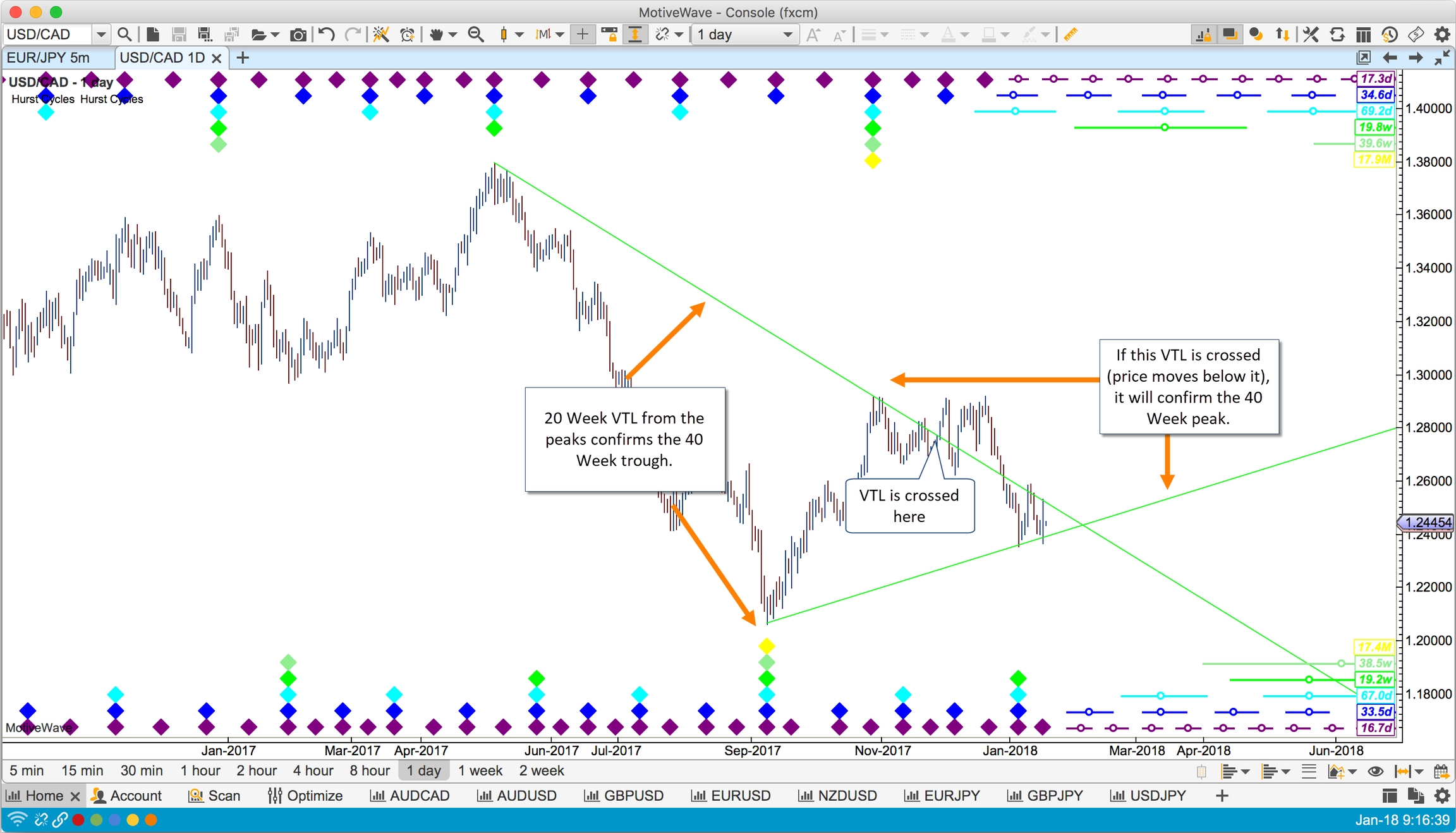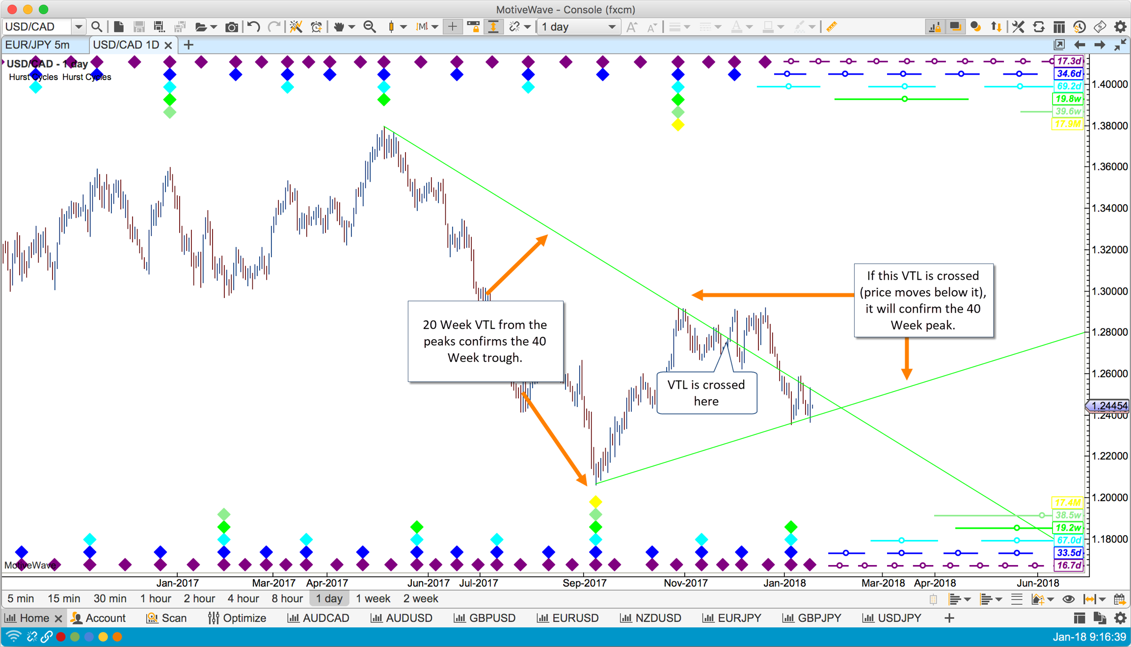 Valid Trend Lines (VTLs) are a very useful tool for confirming price peaks or troughs in your cyclic analysis. VTLs connecting price troughs will confirm price peaks when they are crossed and conversely VTLs connecting price peaks will confirm troughs when they are crossed.