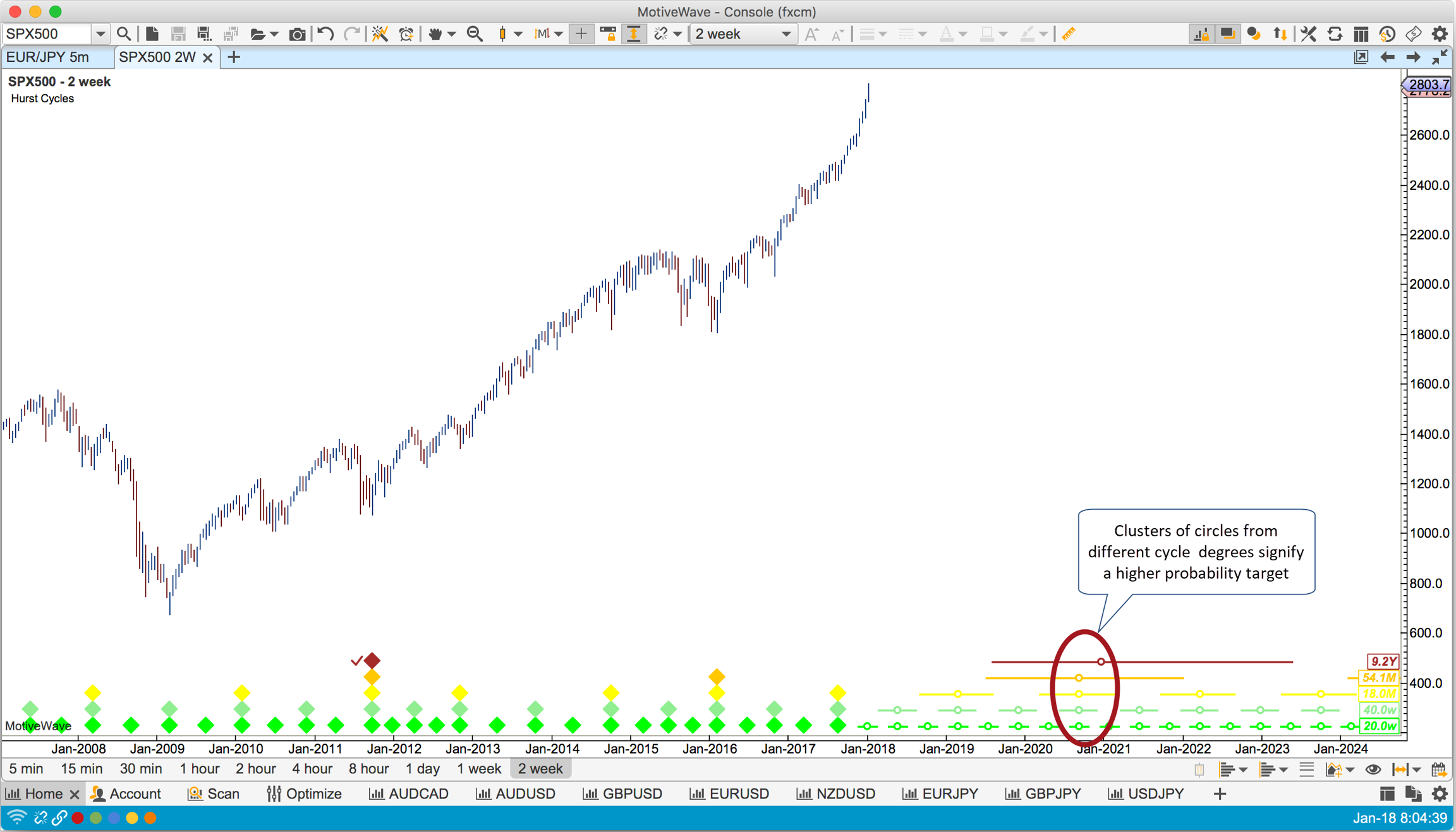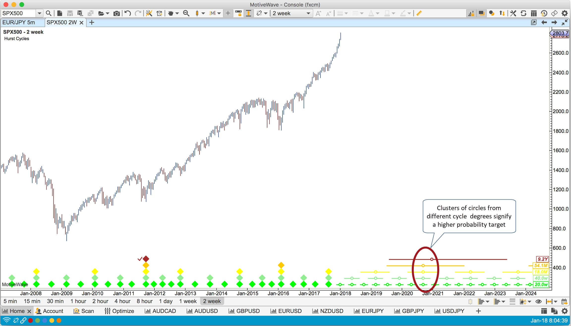 These can be used to predict when a price trough (or peak) may occur. Higher probability targets occur where circles from different cycles cluster together.