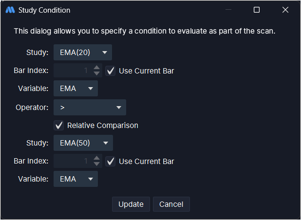 If you checked the Relative Comparison option, the dialog will change to allow you to choose a study and variable for comparison. The Price Bar option allows you to compare to the Open/High/Low/Close values of the price bar. In the example below, two EMAs were added to the studies list and its comparing the EMA(C,20) value to the EMA(C,50) value to see if the first value is above the second.