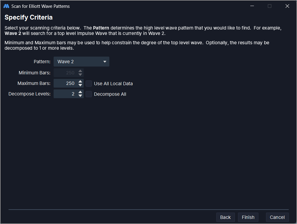 * **Wave 2** – This will search for an Elliott Wave pattern when the top level wave is currently in a Wave 2. Wave 2s are commonly used as trading setups since wave 3 tends to be the longest wave.