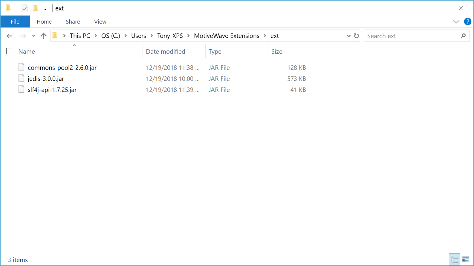 The screen shot below shows an example of third-party libraries added to the ext directory in the Motive Wave Extensions.