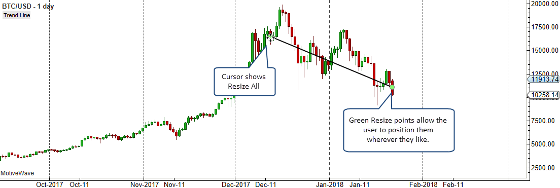 The screen shot below shows an example of using resize points that have a type of ‘All’. This is from the example TrendLine study: