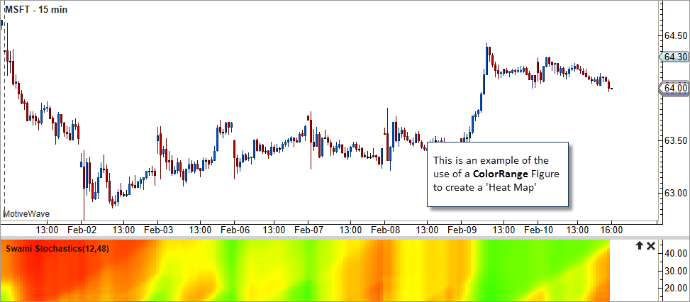 This class is convenient for creating ‘Heat Map’ studies. A good example of this is the Swami Stochastics study. Each ColorRange object is essentially a bar that has a series of colors regions defined for a range of values. The following screen shot illustrates what this looks like: