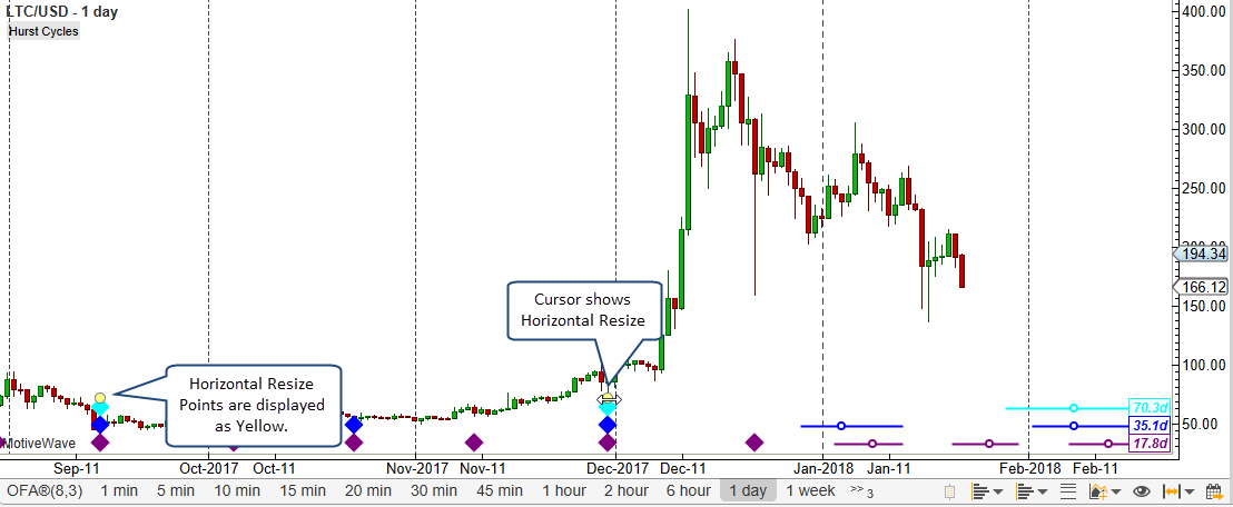 The screen shot below illustrates the use of a ‘Horizontal’ resize point to position the cycles in the Hurst Cycles study: