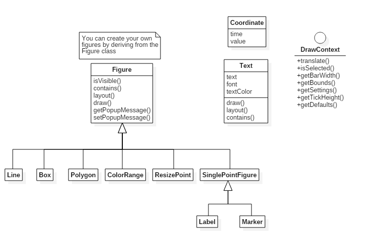 All figures have one or more Coordinate values (see common package) that are used to specify the location of the figure. These coordinates are composed of a ‘real’ time and value that are translated to plot (x,y) points before they are drawn.