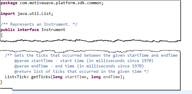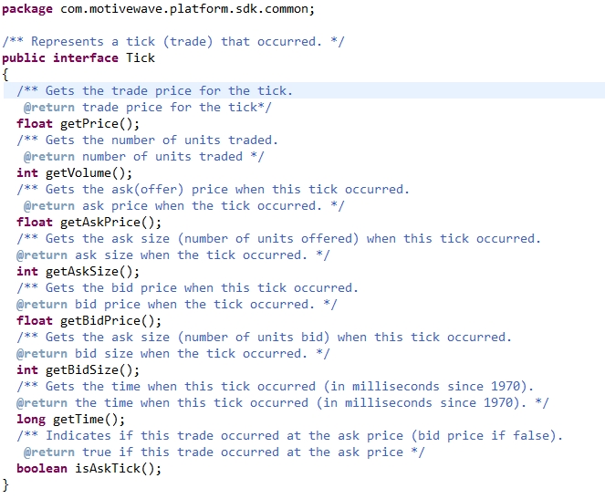 Version 5 of MotiveWave™ includes support for handling live and historical tick data (if supported by the broker and/or data service). Live and historical ticks are described using the Tick interface (see below). The time of the tick can be accessed via the getTime() method. This returns the number of milliseconds since January 1, 1970 (epoch time).