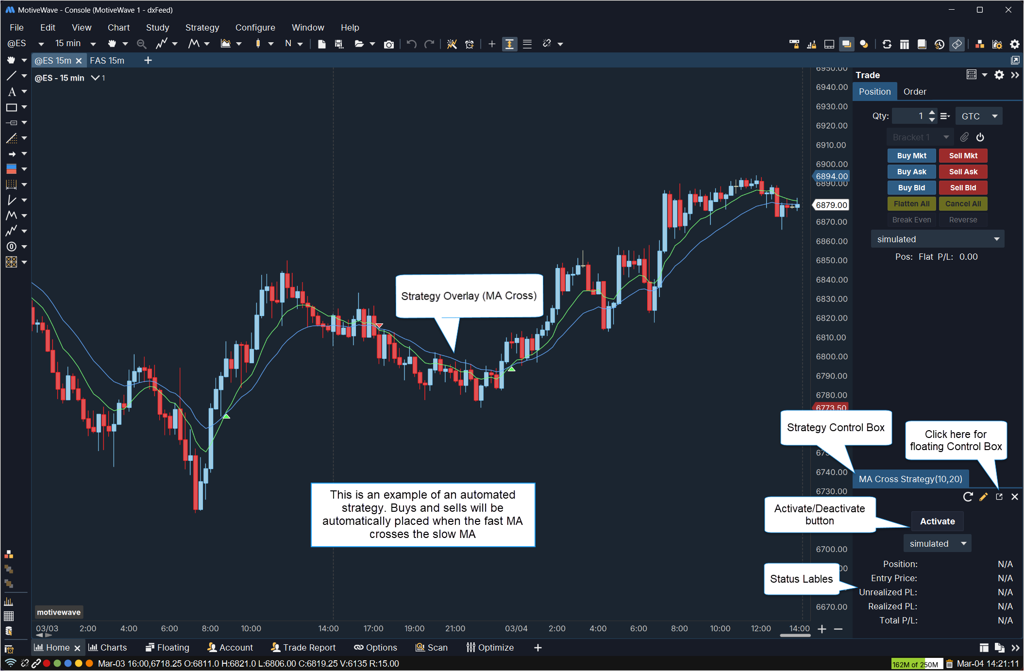 The following screen shot illustrates the Moving Average Cross strategy (MA Cross Strategy). This strategy will buy when the **Fast MA** crosses above the **Slow MA** and sell when it crosses below (see triangle markers below). Each strategy will have a control box (bottom left corner). This will enable you to edit the strategy and activate it. The control box also displays status information.