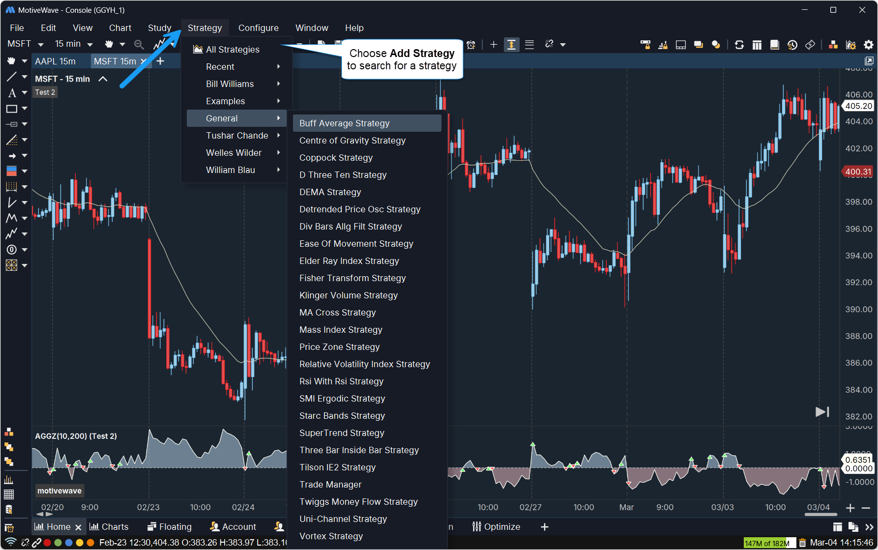 MotiveWave™ comes with around 30 built-in strategies. These can be found under the *Strategy* menu (from the top menu bar).