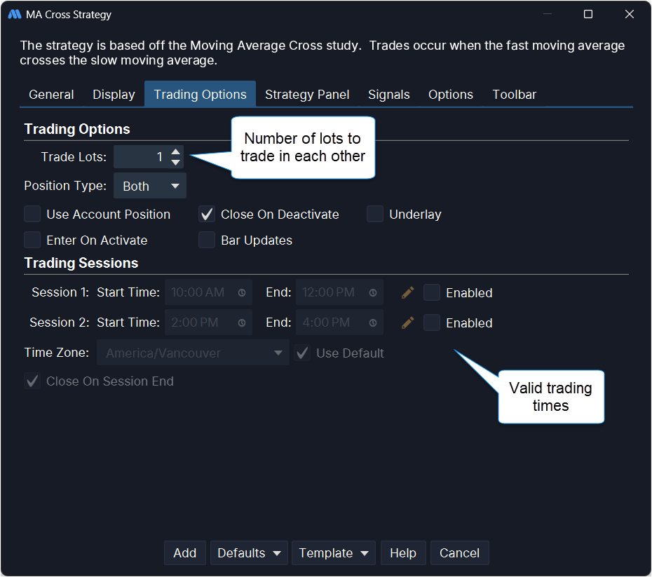 * **Trade Lots** – This determines the quantity on the orders that are used to entry and exit positions. The Trade Lot is multiplied by the default quantity to determine the actual quantity.