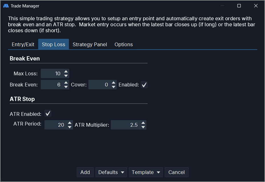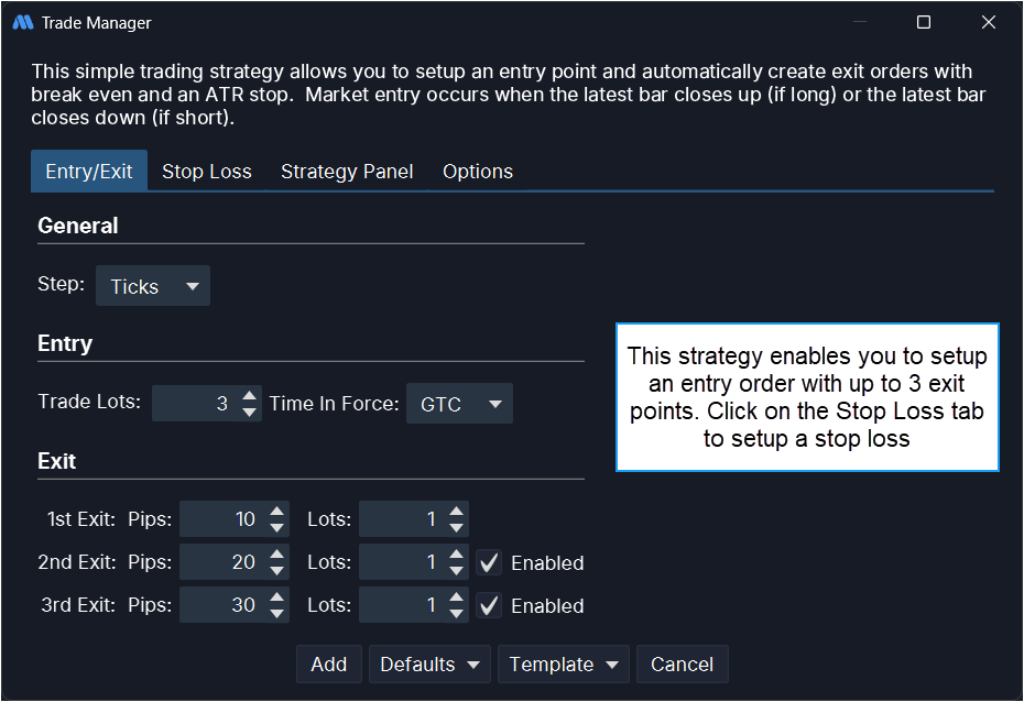 The following screen shots show the configuration options for **Trade Manager**. On the first tab (**Entry/Exit**) you can setup the entry order and up to 3 exit orders. The **Stop Loss** tab provides options for the stop loss order.