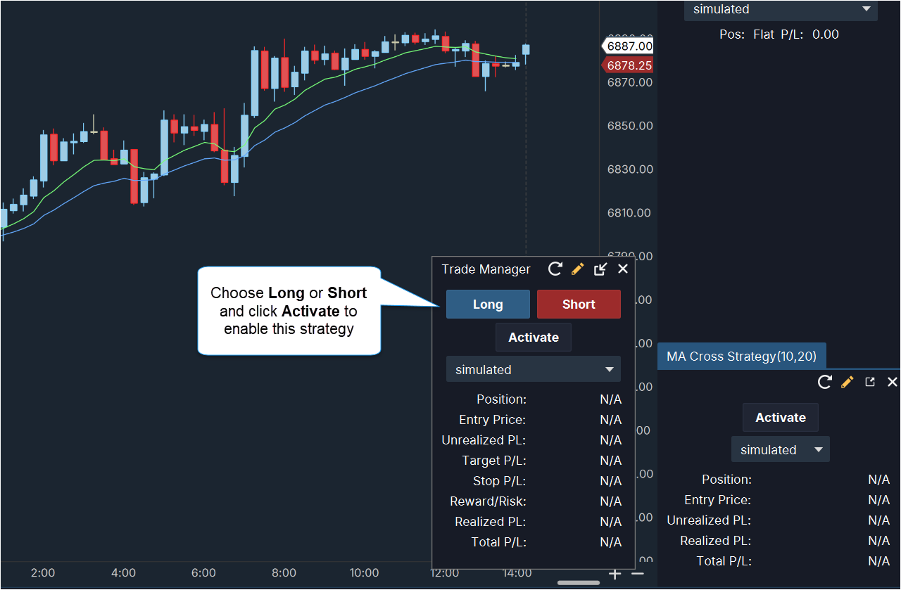 From the **Trade Manager Control Box**, you can choose Long (buy) or Short (sell). When you click the **Activate** button, the strategy will enter on the close of the bar.