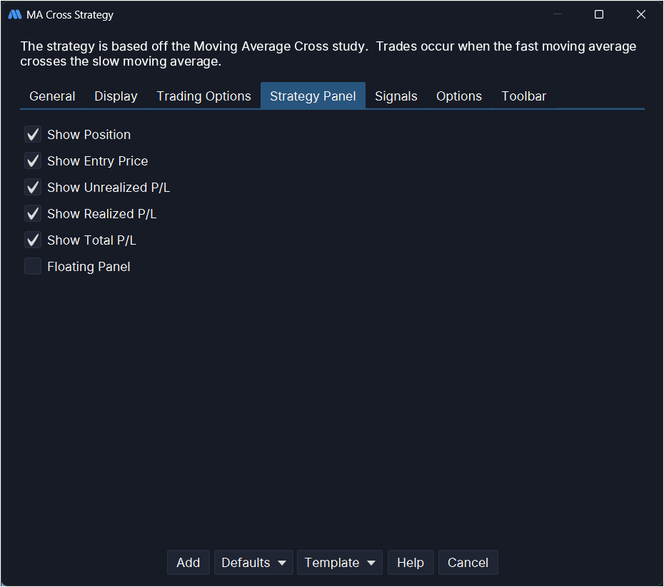 The **Strategy Panel** tab allows you to choose what labels are displayed on the control box. The available labels will depend on the strategy.
