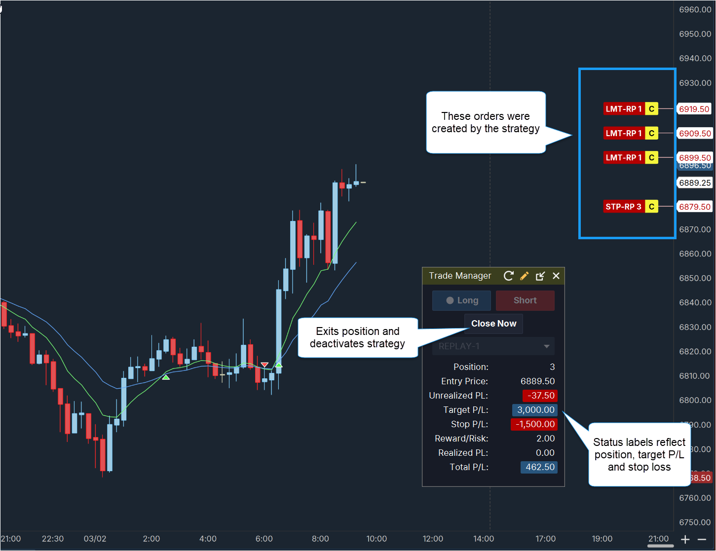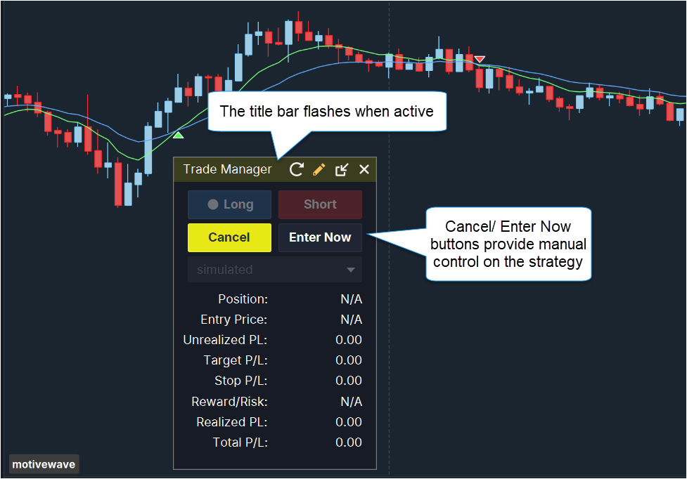 MotiveWave™ allows you to create strategies that respond to user input to enter or exit a position. This can be very useful as a way to help direct and manage exit points for user initiated trades. For an example of how this works, see the Trade Manager strategy.