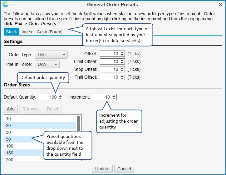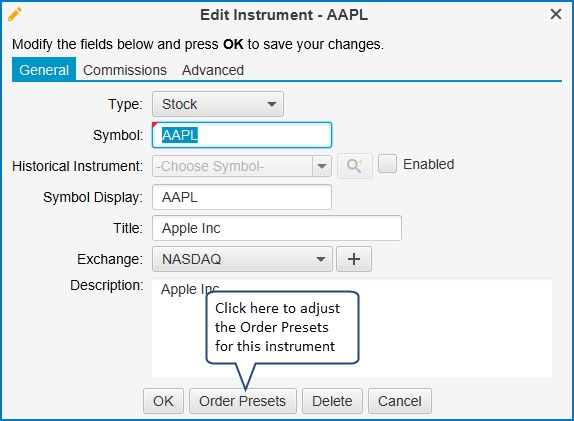 If you would like to change the order presets for a specific instrument, edit the instrument (right click on a chart and choose Edit Instrument) and click on the Order Presets button at the bottom of the dialog.