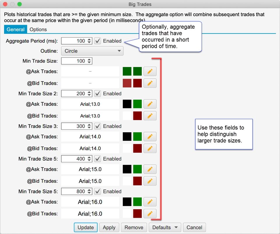 Min Trade Size – Up to 5 trade sizes can be defined to distinguish between smaller and larger trades. Use the Min Trade Size for each level to define the tiers.
