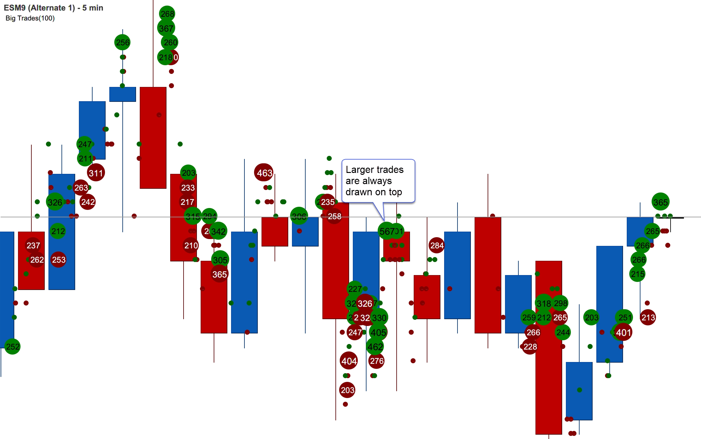 The screen shot below shows the Big Trades study with the settings from above. For convenience larger trades are drawn on top (potentially hiding smaller trades underneath). The following limitations are imposed to avoid performance issues with the study: