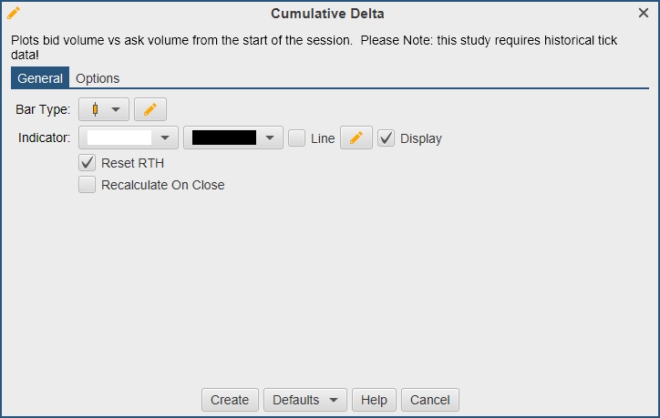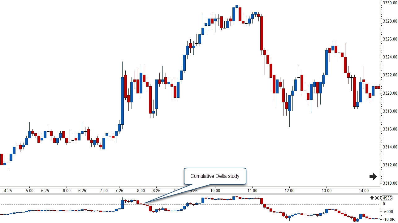 Plots the accumulation of the delta (difference between ask and bid volume). The delta total is reset at the beginning of each session (RTH or ETH). These values are displayed as price bars (candles) in a separate plot.